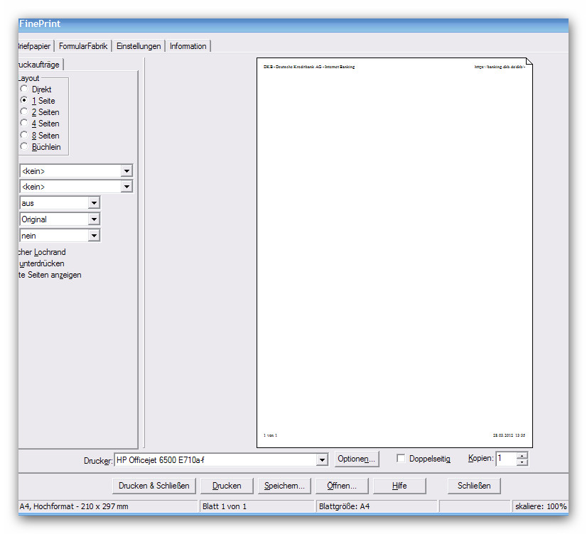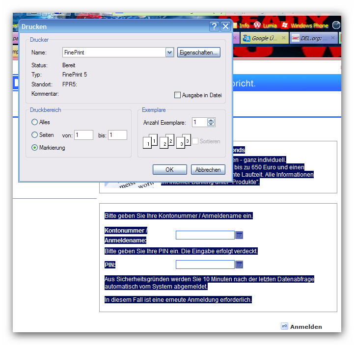 Und so sieht das in der Druckvorschau aus. Manche Markierungen funktionieren, manche nicht. Z.B. bei der Ebay-Anmeldemaske wird der markierte Teil angezeigt, hier bei der Bankmaske nicht.