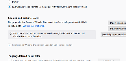 Ich brauche für manche Websites dauerhaft gespeicherte Cookies, kann aber das Feld "Cookies und Website-Daten beim Beenden von Firefox löschen" nicht deaktivieren, es ist auch nur grau hinterlegt. ![]()