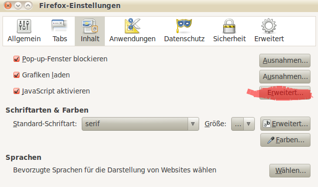 Leider hast du als Beispielseite eine gewählt die eine Anmeldung erfordert. Daher kann ich es nicht testen. Ich vermute aber, dass es von der Internetseite so gewollt ist. Falls du das ändern möchtest ändere die Einstellungen unter Bearbeiten (oder Extras bei Windows) ---> Einstellungen ----> Inhalt -----> Javascript -----> Erweitert.