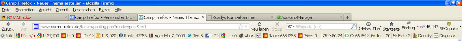 Ich hab schon alles Möglich in den Einstellungen von Seoquake Toolbar versucht, da ändert sich nichts. Ich glaube allerdings nicht, das es daran liegt, da ich bei "Anpassen" ausversehen auf den Knopf gekommen bin, der die Standarteinstellungen wiederherstellt.