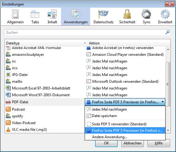 Dann Klick auf "Dateityp" und dort wähle ich rechts "FireFox Soda PDF 5 (in Firefox) verwenden".