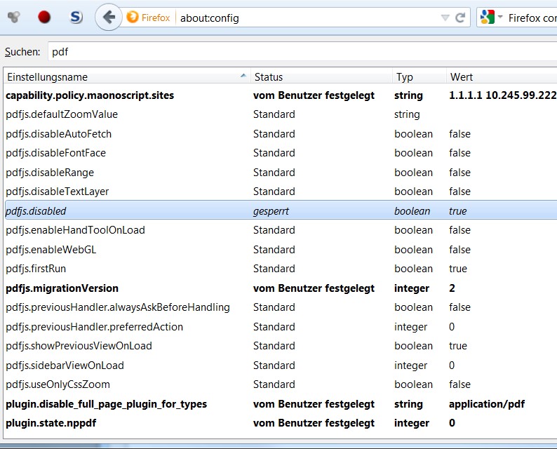 Könnte das an dem "about:config" Eintrag "pdfjs.disabled" - "true" liegen?