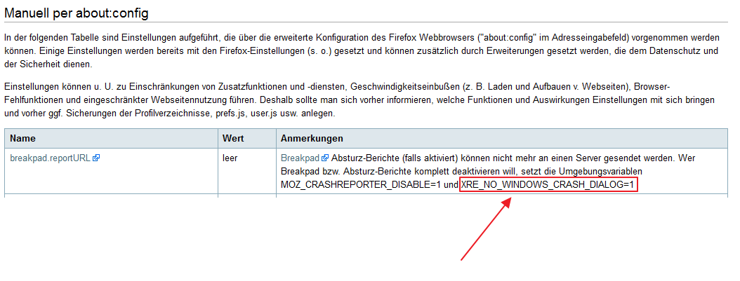 Unter: http://wiki.kairaven.de/open/app/firefox habe ich einen interessanten Beitrag bezüglich der kompletten Deaktivierung der Absturzberichte gefunden.