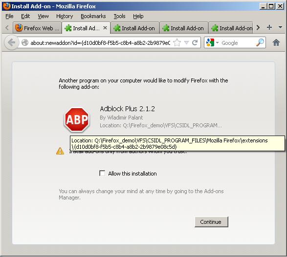 Das funktioniert auch prima bei einer lokalen Installation. Wenn der Firefox allerdings mit exakt den gleichen Einstellungen über AppV zur Verfügung gestellt wird, erscheinen die (unerwünschten) Installationsdialoge für alle Erweiterungen, wie im angehängten Screenshot zu sehen.