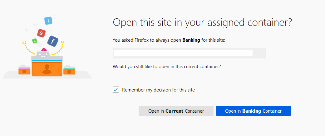 Wenn ich nun danach dieselbe URL in einem Default-Container aufrufe, fragt mich die Erweiterung erneut, ob ich die Seite im voreingestellten Container "Banking" öffnen möchte. Ich markiere "Remember my decision for this site" und klicke auf "Open in Banking Container", der Button reagiert dann aber leider sehr häufig gar nicht, auch wenn ich ihn mehrfach nacheinander anklicke (der linke Button reagiert dann ebensowenig). Nur manchmal, nachdem ich es mehrfach ganz von Neuem probiere (Container wieder alle geschlossen und neue eröffnet), funktioniert es dann irgendwann.