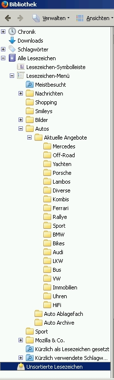 Mir ist eben mal wieder aufgefallen, dass beim Öffnen der Lesezeichen neuerdings (seit 46.0?) immer zuerst die Unsortierten angezeigt werden, das erste ist jeweils markiert. Ich hab es so in Erinnerung, dass vorher der zuletzt gewählte Ordner aktiv war. Im konkreten Fall z.B. der Pfad Lesezeichen > Autos > Aktuelle Angebote, der auch weiter offen ist. Das merkt sich der Firefox also...