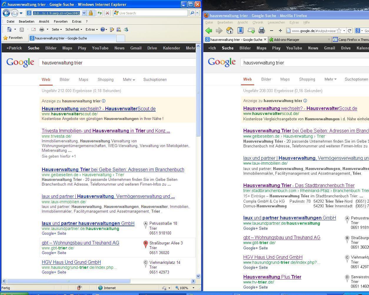 Wenn ich bei google mit dem InternetExplorer nach "hausverwaltung trier" suche, steht die Seite http://www.trivesta.de an erster Position. Tue ich gleiches mit dem Firefox, so wird die Seite gar nicht als Ergebnis angezeigt.Mich würde sehr interessieren, woran das liegen kann?