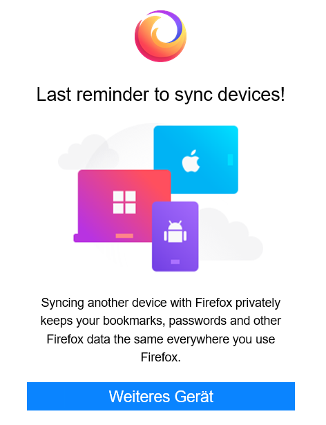 Nun erhalte ich seit Tagen von FF Sync Mails, ich soll doch ein weiteres Gerät hinzufügen. Gut, wenn die mir ein weiteres Gerät kaufen. ![]()