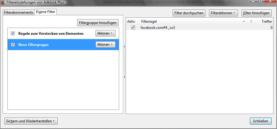 Wenn ich unter "Extras" > "Adblock Plus" > "Deaktivieren auf facebook.com" anklicke, werden alle Filterregeln deaktiviert. Im Fenster "Filtereinstellungen von Adblock Plus" bleiben die aktivierten Haken jedoch ständig aktiviert. Egal ob ich "Deaktivieren auf facebook.com" klicke oder nicht.