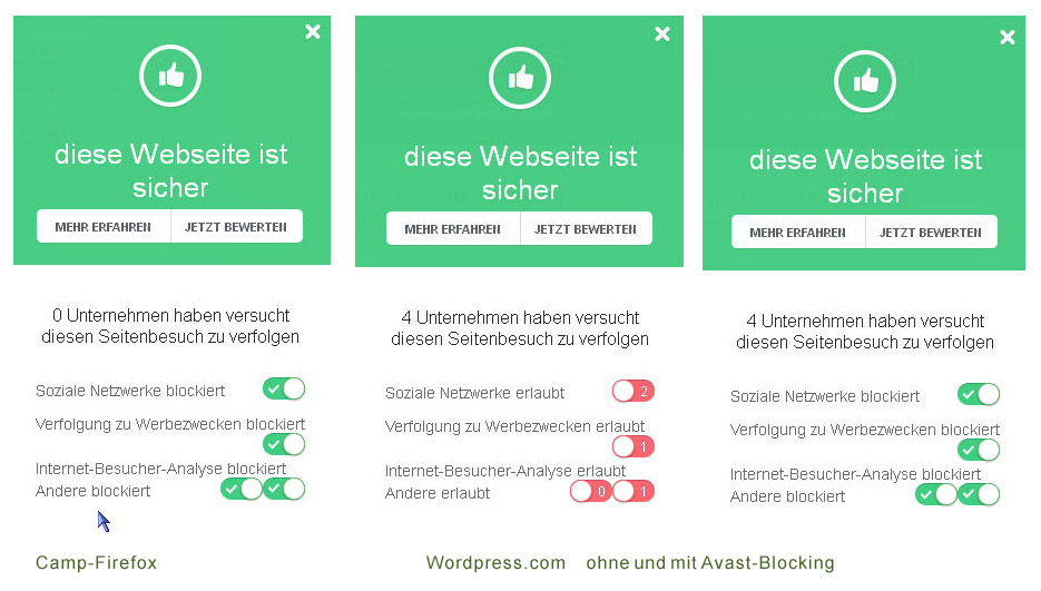 Ich weiss ja, dass FF Phishing und Malware-Protection eingebaut hat, aber ist es nicht möglich, dass avast weitere Seiten kennt und umgekehrt und warum entwickelt avast das Teil wenn's unnötig ist? Hier ein Screenshot über eine weitere Funktion, das Blocken von Analyse-Seiten. Wenn alle Seiten wären wie camp-firefox wär's okay aber die weiteren Beispiele von wordpress.com zählen noch zu einem eher geringfügigen Aufkommen von Schnüfflern.[attachment=0]Screenshot_Avast.jpg[/attachment]