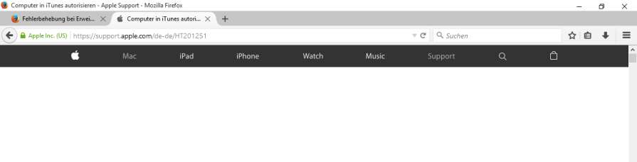 Ich benutze Windows 10 Prof. 64-bit mit Firefox 40.0.3. Bestimmte Apple-Support-Webseiten werden nicht richtig angezeigt, d.h. es wird oben nur eine Leiste angezeigt aber nicht der weitere Inhalt der Webseite. Beispiel: https://support.apple.com/de-de/HT201251