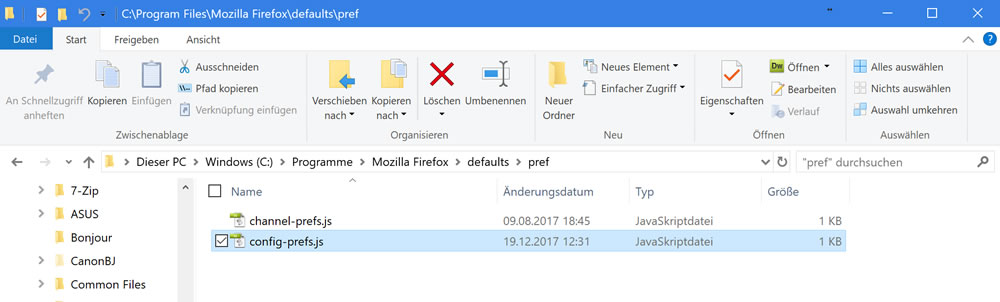In den Unterordner \defaults\pref im Firefox-Programmordner wird die Datei config-prefs.js hineinkopiert.