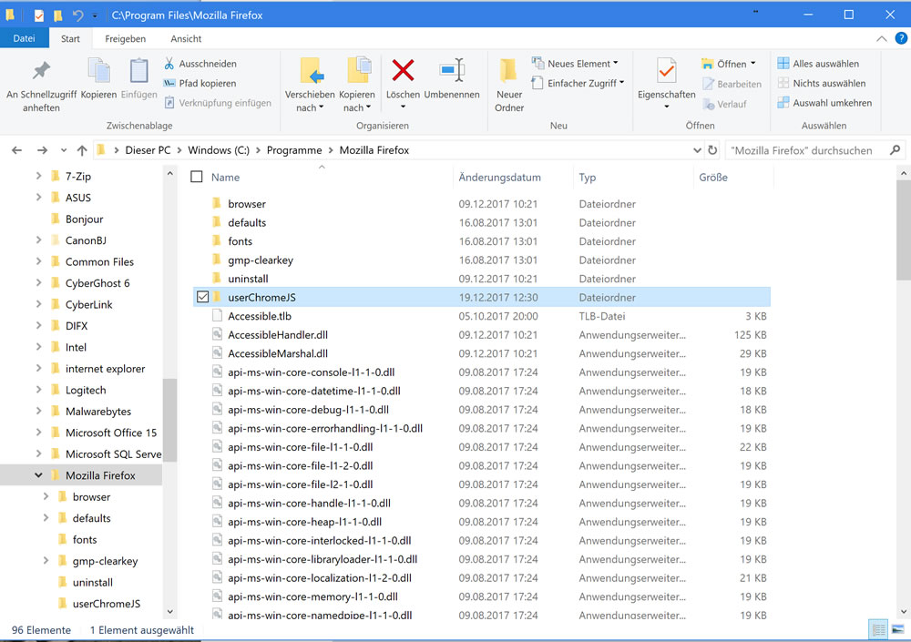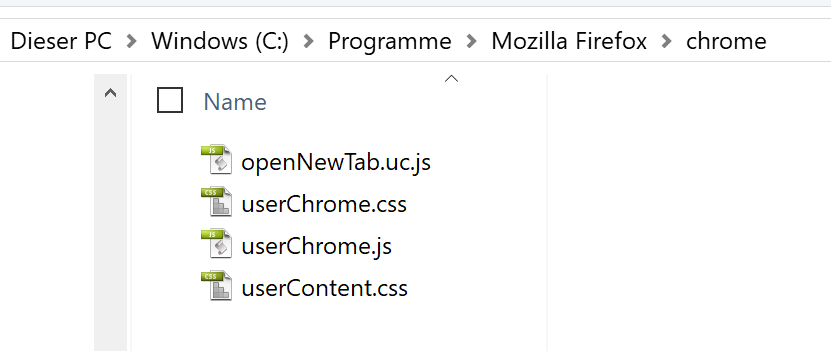 In diesem Ordner mit diesem Pfad ist gar nichts, ausser der Ordner BookmarksFolderImages und die Datei userChrome.js. Hat das mit der 64 Bit Version zu tun? Ich habe die Dateien im Ordner Programme > Mozilla Firefox abgelegt.