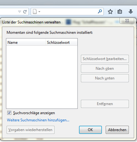 Das Suchfenster wird zwar in Firefox angeziegt. Es ist aber "leer": es wird keine Suchmaschine angezeigt, es lassen sich keine Suchmaschinen hinzufügen, ein eigegebener Suchtext führt (logischer Weise) auch zu keinem Suchergebnis (Firefox sucht nicht).