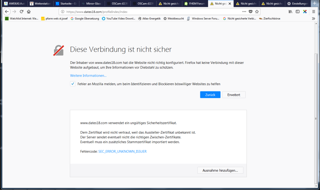 Es lassen sich auch keine Ausnahmen hinzufügen.Eigenartig ist nur dabei das normale http Seiten ohne irgend einen Hinweis geöffnet werden. :-???