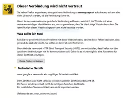 Allerdings stehe ich bei "google.at" komplett an - hier ist Firefox offenbar ganz, ganz streng, die Meldung besagt, daß es in diesem Fall nicht möglich ist, eine "Ausnahme" anzulegen - siehe beilieg. Screenshot.