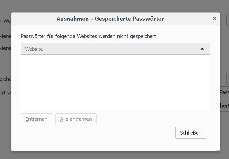 ich will praktikablerweise meine PW durch den PW-Manager verwalten lassen, aber eben nicht alle. Darum will ich Ausnahmen hinzufügen. Das gelingt mir bei FF 38.0.1 nicht. Ich poste mal was ich sehe. Es gibt da keine Möglichkeit eine Ausnahme hinzuzufügen, obwohl ich an der richtigen Stelle bin.