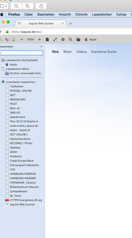 Meine Lesezeichen sind in der Sidebar zu sehen. Wenn ich eine Adresse aufrufe erscheint die Seite nur in der Breite der Sidebar und nicht auf gesamten Screen.