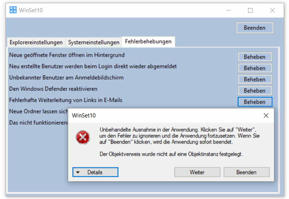 Das sieht ja schon mal sehr vielversprechend aus. Nun hab ich winset.zip geöffnet und wenn ich auf "Fehlerhafte Weiterleitung von Links in Emails" klicke, dann kommt dieses Meldungsfenster. Und jetzt bin ich nicht Experte genug, um das einschätzen zu können, weil ich ja nix kaputt mamchen möchte. Ist das ungefährlich?