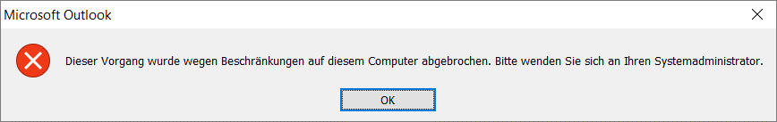 auch dort hab ich nichts gefunden, zusätzlich noch ein paar Sicherheitsbeschränkungen testhalber ausgeschaltet, Virenschutz abgeschaltet. Bringt alles nix. Auffällig ist auch noch, dass die Fehlermeldung den Zusatz enthält, man solle sich an den Systemadministrator wenden. Das deutet ja auch eher auf ein grundlegendes Systemproblem hin und weniger auf Einstellungen im Outlook selbst. Oder sehe ich das nicht richtig?