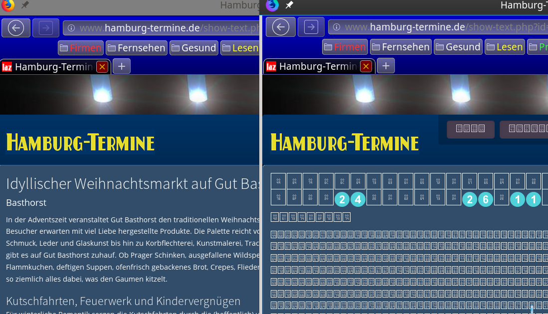 Ich habe gerade ein neues Nightly-Problem entdeckt. Webseite: http://www.hamburg-termine.de/show-text.php?id=00000390 aber auch noch einige andere Seiten von dieser Domain, aber nicht alle. Bei anderen Domains ist es mir noch nicht aufgefallen.