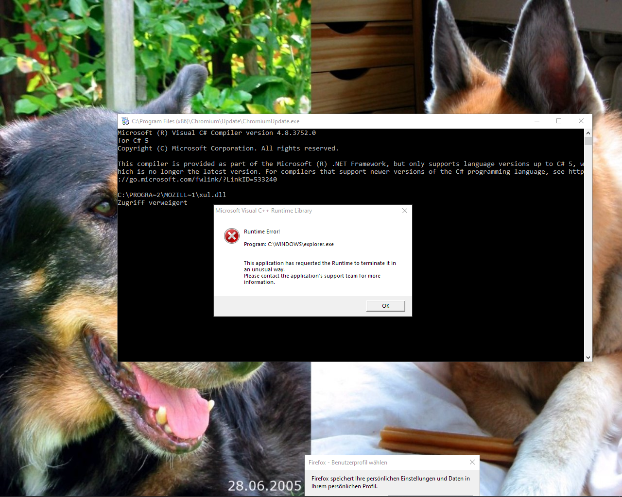Seltsamerweise bekomme ich von W10 zuvor immer wieder eine Meldung in Bezug auf "Visual C# Compiler" und dann von C++ einen Runtime error.