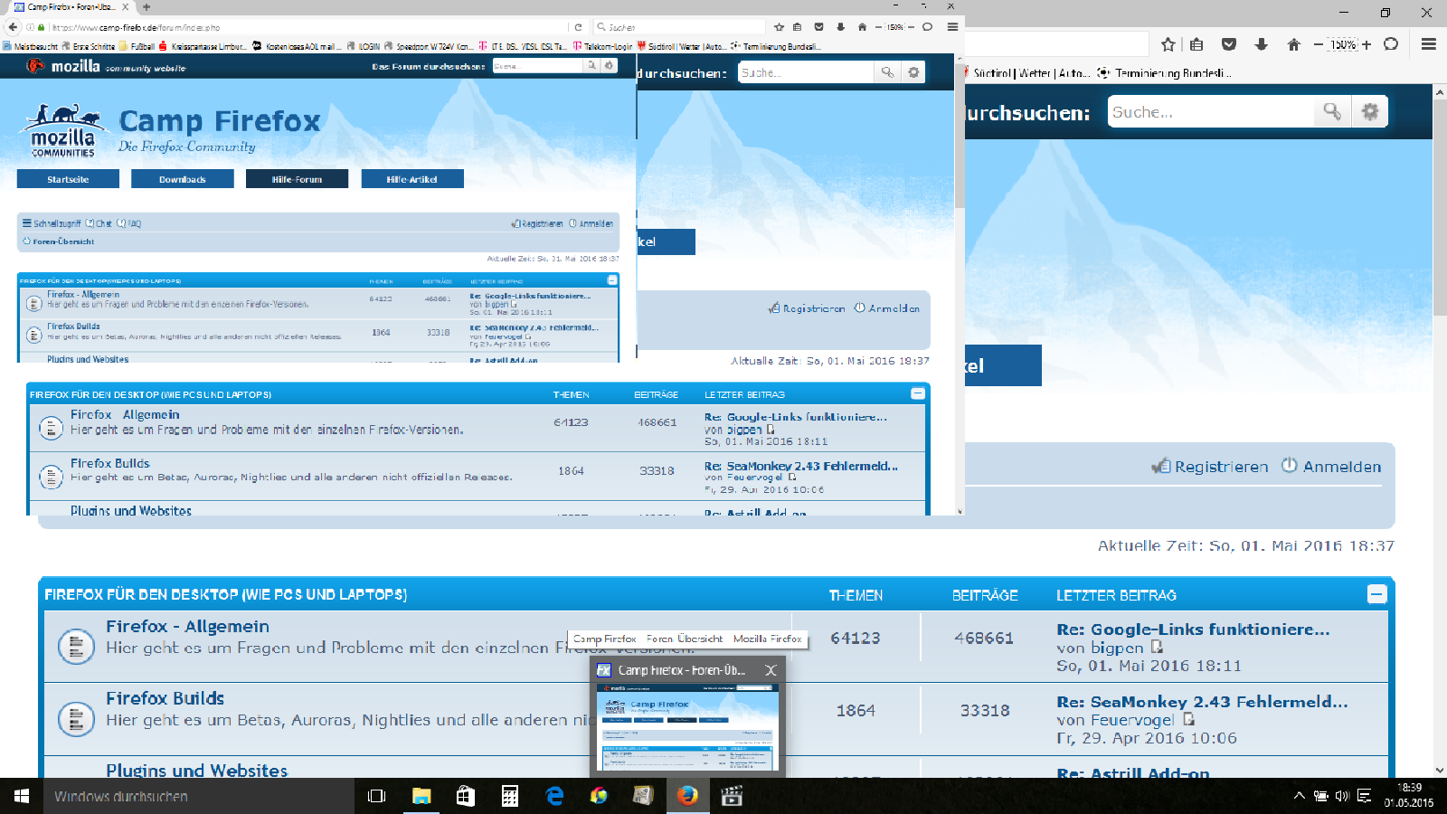 Seit Firefox auf 46.0 abgedatet wurde habe ich folgendes Problem.Ich öffne Mozilla Firefox über die Taskleiste -> gehe auf das Forum hier -> gehe mit dem Cursor auf den Mozilla Button in der Taskleiste -> da wird oberhalb das Vorschaufenster angezeigt -> dann gehe ich mit dem Cursor in das Vorschaufenster -> da wird aufeinmal die Forumsseite dreifach überlagert angezeigt.