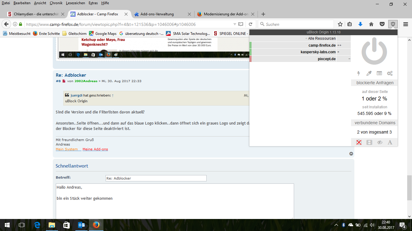 Also, bin ein Stück weiter gekommen, es ist tatsächlich der uBlock Origin installiert und seltsamerweise jetzt auf der Leiste sichtbar, warum auch immer. Außer Kaspersky und Spiegel.de kenne ich die dort aufgeführten Inhalte nicht.