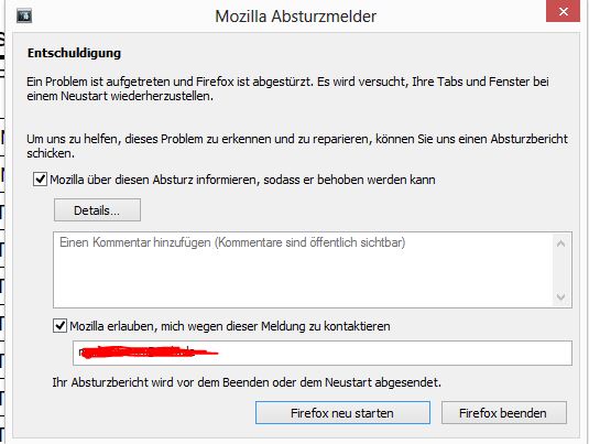 mein Firefox 50 (64-Bit) lässt sich nicht mehr starten, da bei jedem Versuch der Absturzmelder öffnet. Hierbei nutzt kein Klick auf FF neustarten oder beenden o.ä.