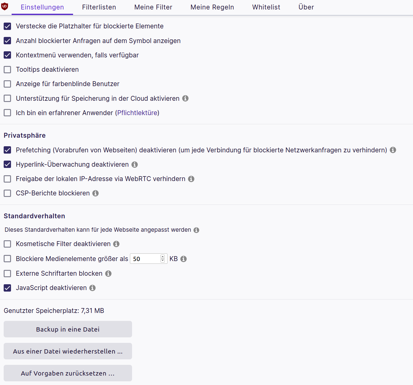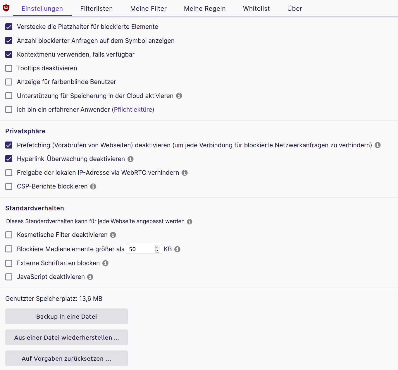 Das zeigt er mir an wenn ich auf mehr klicke in uBlock.