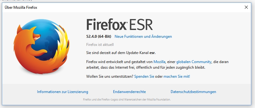 ... übrigens sind wir schon bei der Version 52.4.0 ESR, bitte mal aus Sicherheitsgründen updaten.