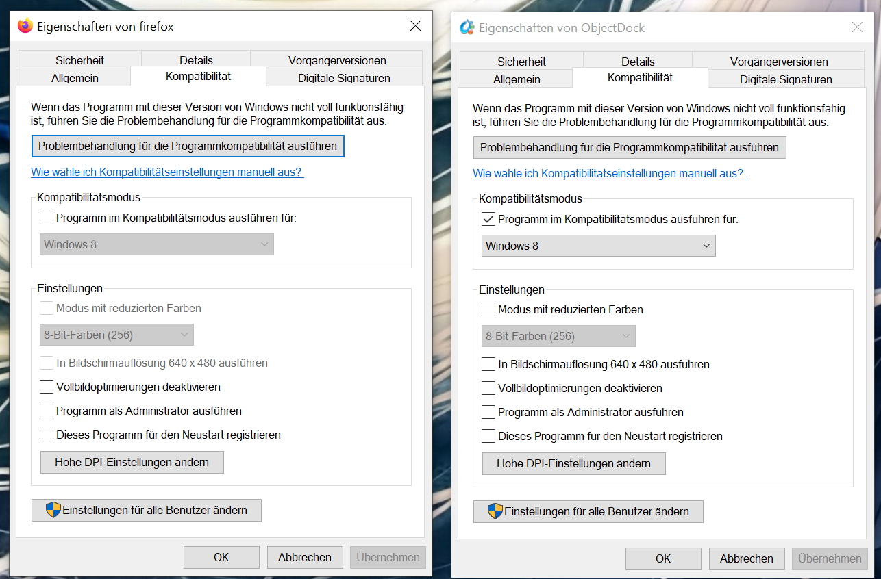 Zustand: FF im Kompatibilitätsmodus (egal ob Win7/8) aber OD nicht: Funktioniert nicht mehr.