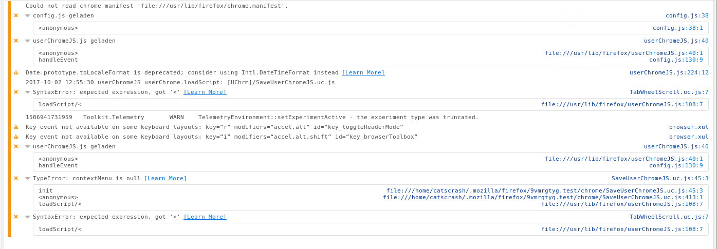 Kann man Firefox dazu bringen mehr Debug Ausgaben zu liefern, bzw. kann ich in Firefox irgendwo sehen ob die config.js und userChromeJS.js geladen wurden?