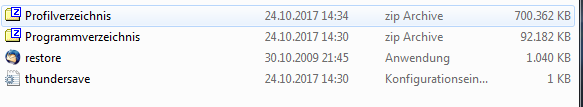 Wenn ich schon mal dabei bin - ich im ordner in den ich die Sicherung von Firefox sichere eine Datei mit dem Namen "restore". Ich denke das man darüber die Sicherung wieder einspielen kann.Wenn ich aber in den Ordner für Thunderbird schaue fehlt so eine Datei? Habe ich etwas falsch gemacht?