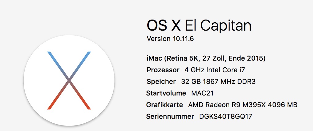 Ich arbeite auf einem iMac. OSX El Capitan, 10.11.6, siehe beil. Screenshot 2