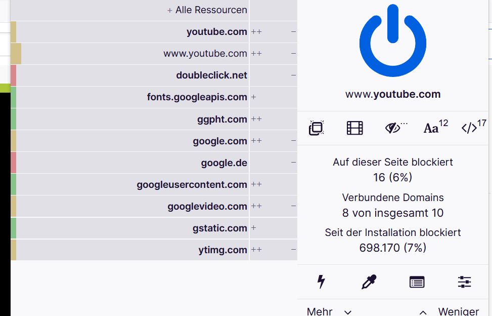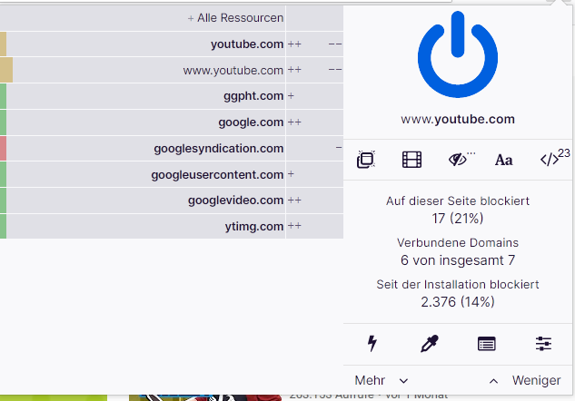 Beim Rosin-Video werden hier 18% blockiert. Was hier noch aktiv ist, ist der Enhancer für Youtube Videos (Erweiterung)