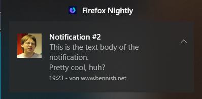 [attachment=0]ApplicationFrameHost_2018-11-10_15-51-17.png[/attachment]Jetzt nochmal zu deinem Problem: Könnte es möglicherweise sein, dass du eine Portable Nightly Version verwendest? Denn in einem kurzen Test mit einem Portablen Firefox Nightly funktionierte bei mir auch nur die Standard Benachrichtigungen von Firefox. (ich verwende bei mir ein installiertes Firefox Nightly)