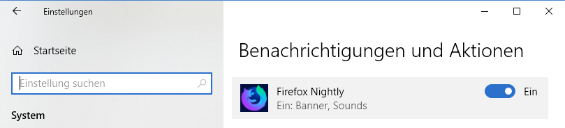 seipe Ich würde einmal probeweise versuchen, dein Firefox Nightly mit dem aktuellsten Installer erneut zu installieren. Es könnte ja sein, dass bei dir nicht richtig eine BuildID gesetzt worden ist, was auch ein Grund sein könnte, weswegen Firefox Nightly bei dir nicht unter "Benachrichtigungen dieser Absender abrufen" auftaucht.