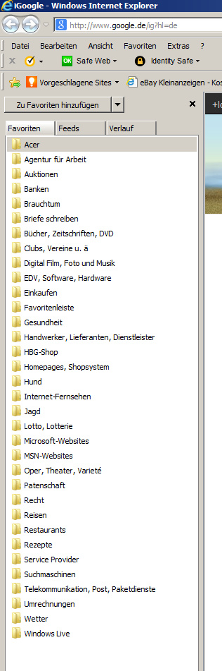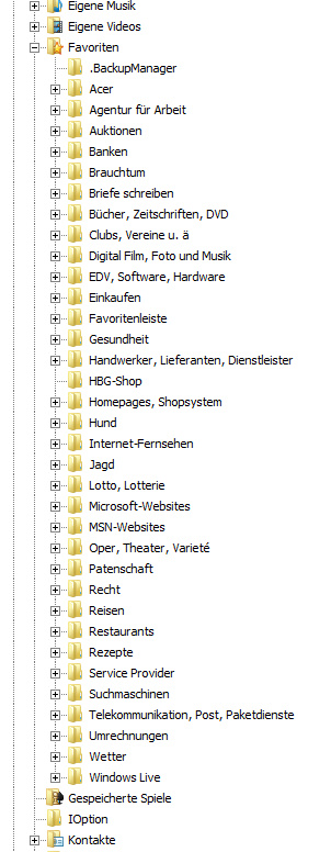 Also installierte ich den FF neu in der Hoffnung, die Lesezeichen danach wieder angezeigt zu bekommen. Das war leider eine Fehlannahme. Die Anzeige sieht so aus, wie aus dem Anhang (Anzeige FF.jpg) ersichtlich. Einen Screenshot, auf dem die Favoriten im Explorer zu sehen sind, hänge ich ebenfalls an (Anzeige Explorer.jpg). Im IE werden die Favoriten korrekt angezeigt (s. Anhang "Anzeige IE.jpg").