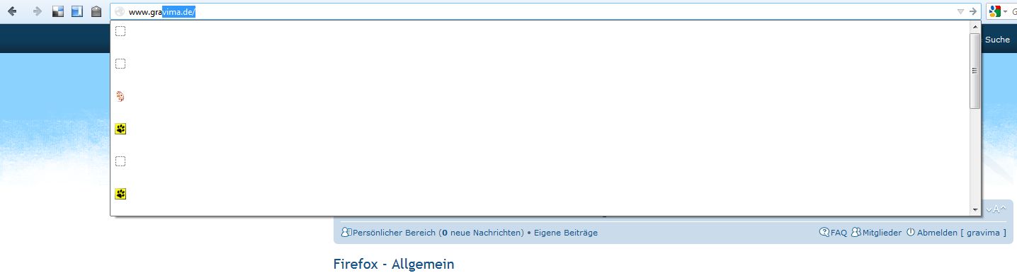Seit dem Update auf 16.01 bzw. seit kurzem zeigt mir der FF 16.01 nur noch die Favicons in der Vorschlagsliste der zuletzt besuchten Seiten. In der Chronik wird alles korrekt angezeigt. Habe auch schon ein erneute Installation (jedoch ohne vorherige Deinstallation) durchgeführt - einfach drüber gebügelt.