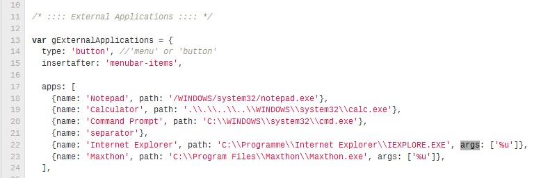 {name: 'FreeCommander', path: 'C:\Programme\FreeCommander\FreeCommander.exe', args: ['%u']},