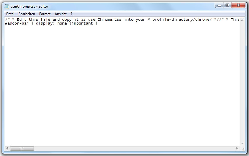 An diesen Eintrag habe ich die Zeile "#addon-bar { display: none !important }" angehängt (Siehe Anlage). Das blieb jedoch erfolglos.