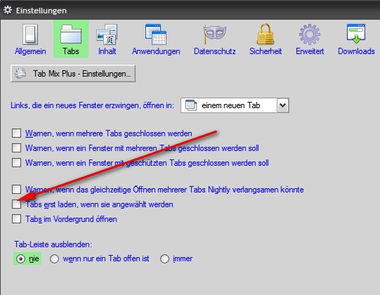 Load Tabs Progressively https://addons.mozilla.org/de/firefox/add…-progressively/ , welches ich als Ersatz verwendet habe, scheint spätestens seit FF 18.0.1 auch nicht mehr zu funktionieren (wie ein anderer User ebenfalls festgestellt hat), entgegen den eingestellten Begrenzungen (maximale Anzahl gleichzeitig zu ladender Tabs 3, maximale Anzahl geladener Tabs 10) werden alle Tabs geladen.