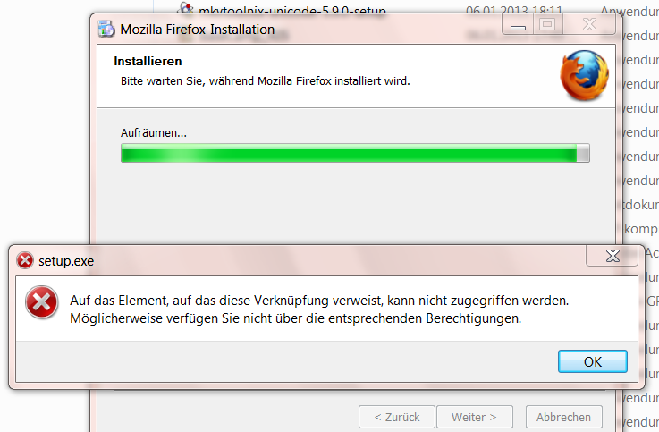 A) Mit und ohne Adminrechte also "als Administrator ausführen", hatte ich bei der Neuinstallation von Firefox ohne Erfolg ausprobiert