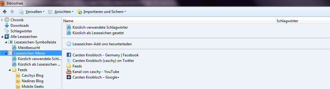 danke für deine Rückmeldung. Warum es bei dir so aussieht, weiß ich nicht, aber in meinem cleanen Fx 18.0.2 Profil (nicht portable) war es wie beschrieben vorhanden. Die Leiste wird übrigens nur sichtbar, wenn eine Suche ausgeführt wird. Vielleicht liegt es daran? Ich habe mittlerweile auch den passenden Eintrag bei Bugzilla gefunden: Klick. Es war ein Firefoxfeature, genannt "scope bar" (sie beinhaltete u.a. auch noch einen Speichern-Button für gespeicherte Suchen) und diese wurde mit Fx 19.0 entfernt. Unmutsbekundungen darüber von Usern finden sich auch im Bugreport. Es geht wohl darum, dass die Bibliothek lang?/mittel?/kurz?fristig in einen Tab gepackt werden soll, was Codeoptimierungen nötig macht. Ist dieses primäre Ziel erstmal erreicht (Bibliothek in Tab), können wir evtl. auch auf eine neue und verbesserte Suchfunktion hoffen.