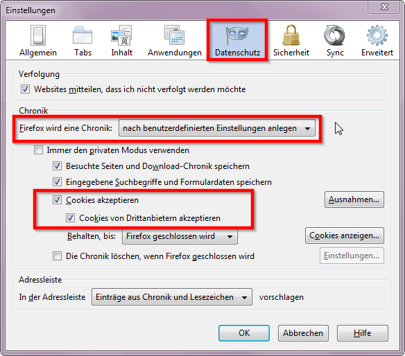 mein Problem bezieht sich auf Cookies von Drittanbietern. In älteren Versionen von Firefox, z. Z. habe ich 19.0, war es möglich, Selbige über ein zu setzendes Häkchen auszuschließen.