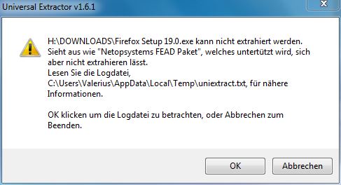 Im Fall des UE wird standardmäßig im Ausgangsordner (hier: Downloads) ein Unterordner mit dem Namen der zu extrahierenden Datei (hier: Firefox Setup 19.0.exe) erzeugt, da kommen alles zusammen genommen nicht einmal 20% der zulässigen Zahl in Sicht. Und wie gesagt, auch über UE wird letztlich der Installer selbst zum extrahieren verwendet. Wenn es da intern im Dateipaket wegen zu tiefer Verschachtelung Probleme gäbe, würden die bei jeder stinknormalen Installation auf einem XP-System (wo das Entpacken im Temp-Ordner des betreffenden Windows-Kontos passiert, also in dem Super-Ungetüm "C:\Dokumente und Einstellungen\Benutzername\Lokale Einstellungen\Temp") schon längst geklingelt haben. - Von der daher bleibe ich dabei, die Pfadlänge als Fehlerursache kategorisch auszuschließen.