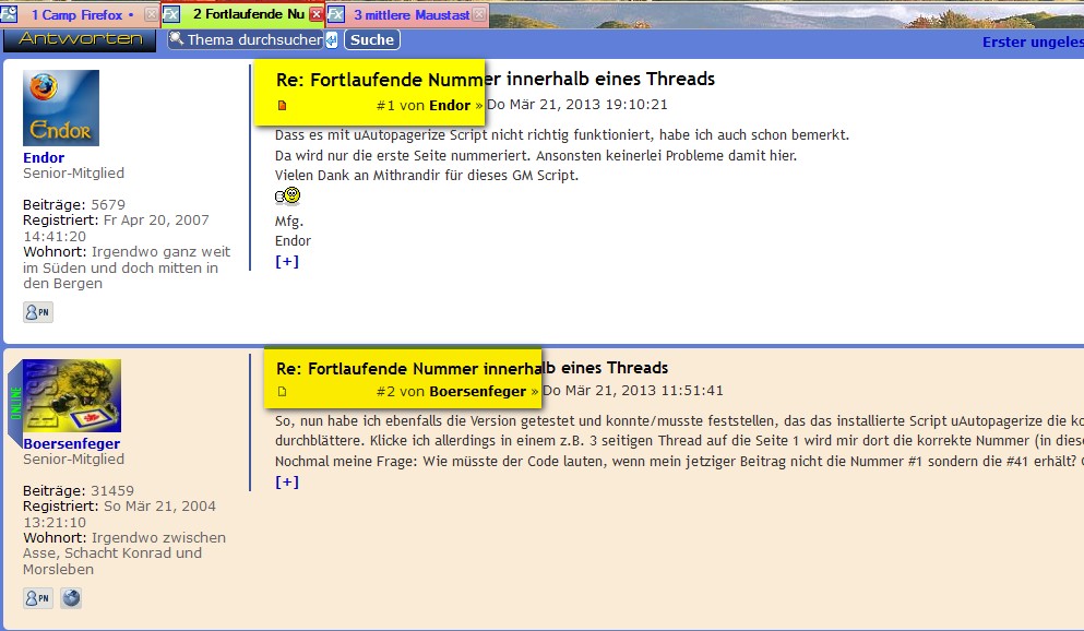 So, nun habe ich ebenfalls die Version getestet und konnte/musste feststellen, das das installierte Script uAutopagerize die korrekte Zählung verhindert, wenn ich den Thread damit durchblättere. Klicke ich allerdings in einem z.B. 3 seitigen Thread auf die Seite 1 wird mir dort die korrekte Nummer (in diesem die Nummer #40) angezeigt.