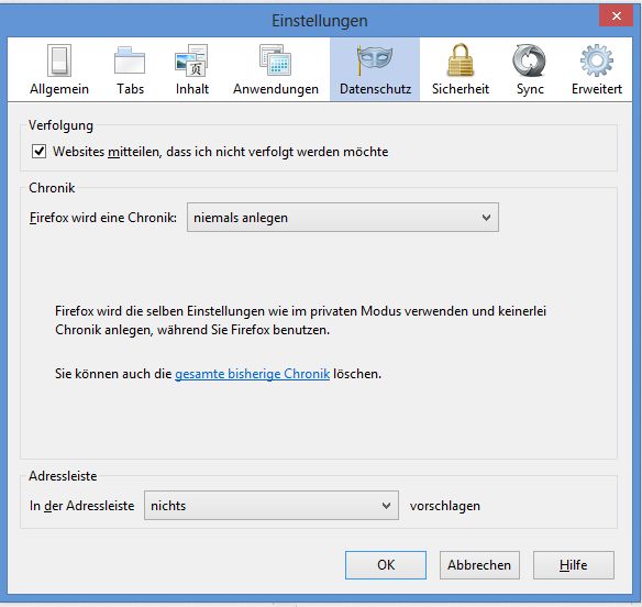 seit FF 20.01 kann ich zwar wie bisher im privaten Modus arbeiten. Allerdings wird trotzdem eine Chronik angelegt und diese nicht automatisch gelöscht. Nach dem Neustart ist eine Chronik der letzten Tage und die dazu gehörigen cookies sind auch da.
