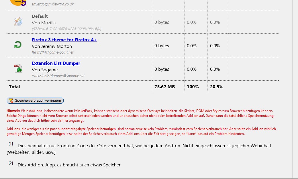 Zitat von TmoWizardIch habe hier aber wie geschrieben 6 GB RAM, daran sollte es also weniger liegen. Außerdem zeigt "vsize" in about:memory den virtuellen Speicher von SeaMonkey/Firefox/Thunderbird an, der hat aber mit dem virtuellen Speicher des verwendeten Systems nichts zu tun! "vsize" zeigt mir gerade eben 1.942,43 MB, während der Systemmonitor 0 B anzeigt.